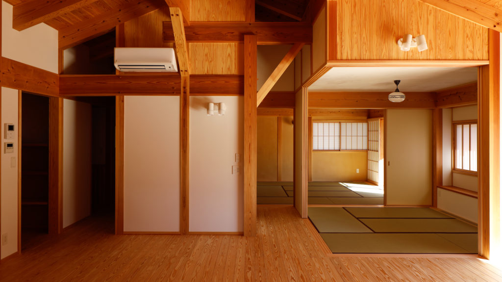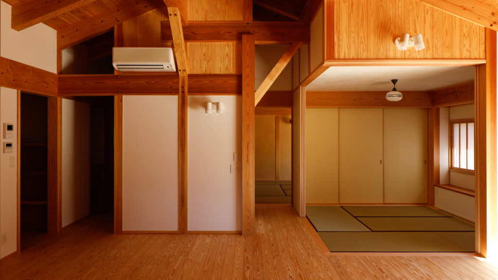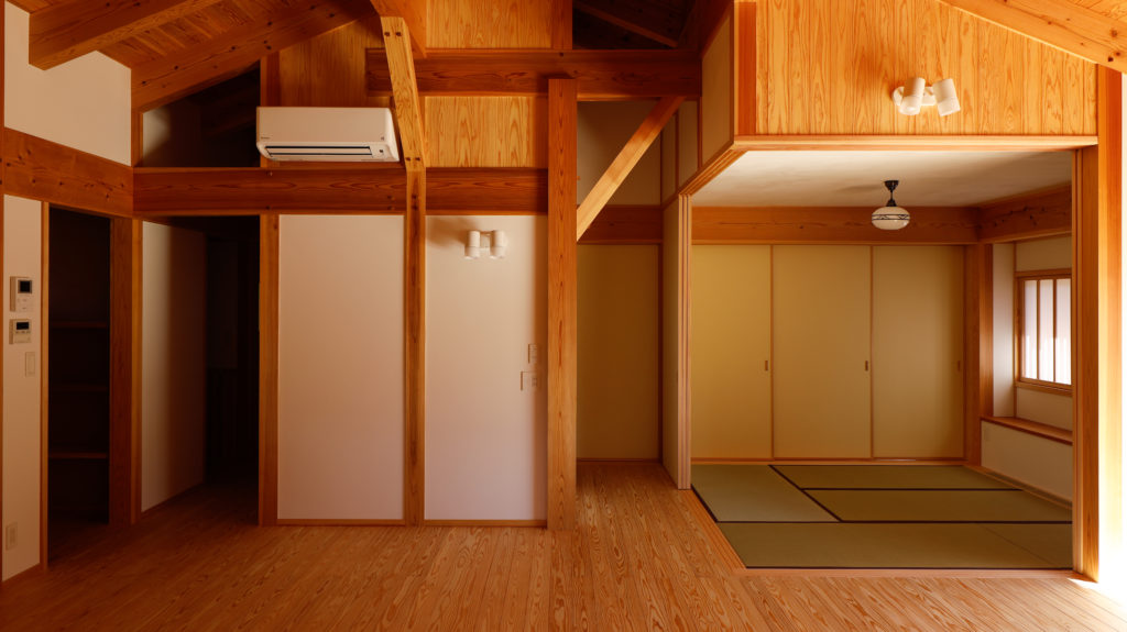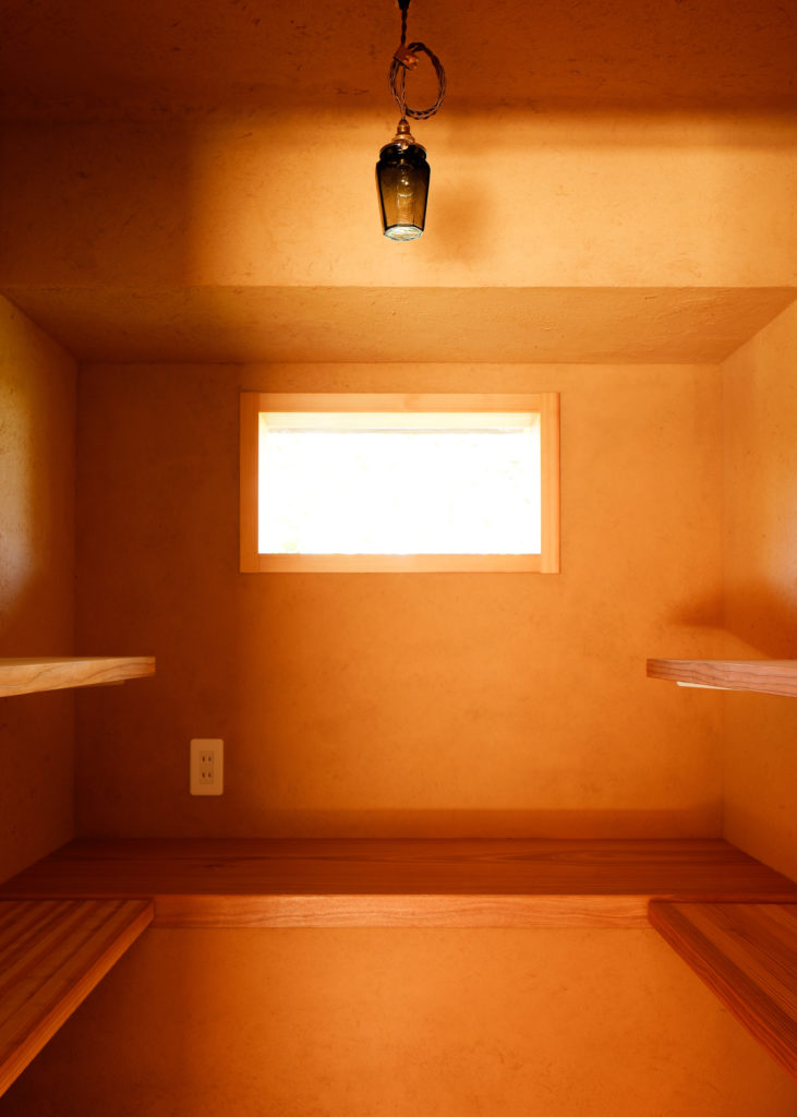居間の真ん中にイエルカさんの薪ストーブ、後ろの漆喰壁は厚さ約120mmの土壁が下地
