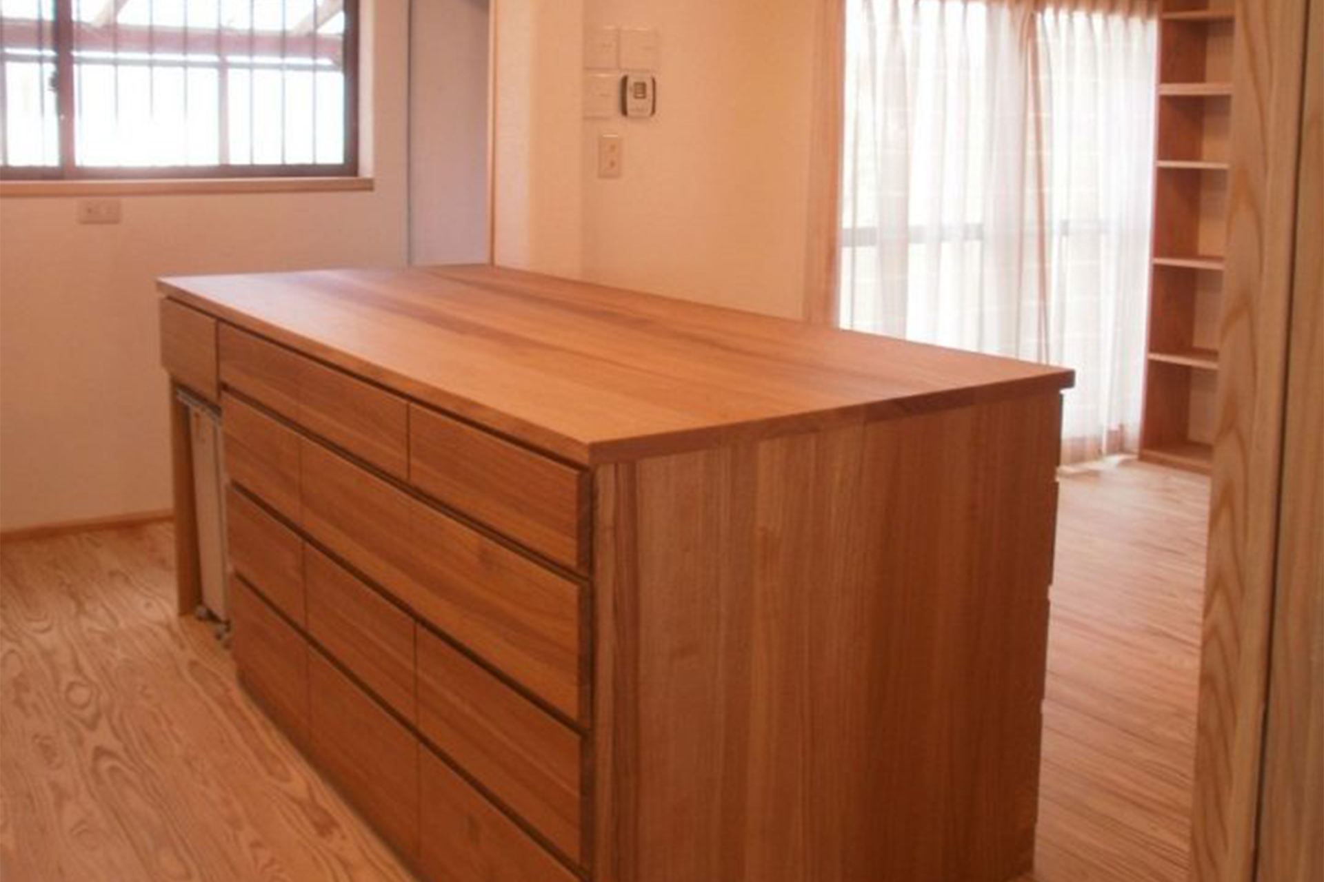 作業台と食器棚兼用の奥行きのあるキッチンカウンター、テレビ台兼用の大きな本棚、洗面台はタイルと家具工事による造作、間仕切り建具の交換など、木をふんだんに使ったリフォームとなった。