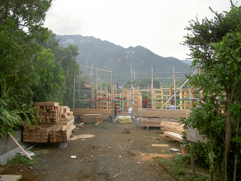 建築場所は屋久島の南部、屋久島の中でも気候風土が穏やかで、北部にはモッチョム岳がそびえ、上水道も下水も通っている、素晴らしい場所だった。仕事の方針として、今後メンテナンスが必要となるであろう電気と設備、知り合いがいる基礎工事は屋久島の業者に頼み、それ以外の工事は悠山想の職人が行く(施主の協力により大工と左官は現場のすぐ隣の家に住み込んだ)、ということにした。また、家づくりに関わりたい、という施主は塗装工事を一手に引き受けて、現場で職人と一緒に働いてくれた。